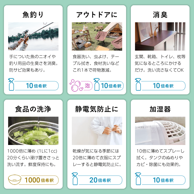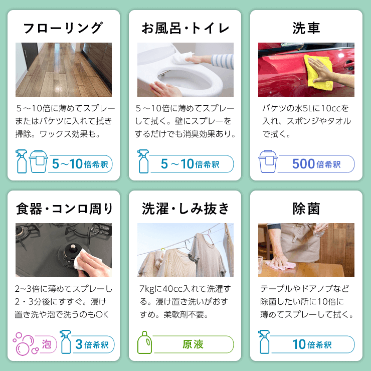 10倍希釈でスプレーして拭く。ワックス効果もあります | 10倍希釈でスプレーして拭く | バケツの水5Lに10ccを入れスポンジやタオルで拭く | 2~3倍希釈でスプレー後、2~3分後にすすぐ | 10倍希釈でスプレーして拭く | フィルターに10倍希釈でスプレー後、2~3分後に洗い流す | 7kgに原液40cc投入。つけおき洗いがおすすめ | 原液でつけおき洗い | 10倍希釈でスプレーして拭く | 10倍希釈でスプレー | 1000倍に薄めた水に20分程つけおき洗う | 20倍希釈でスプレー後、1~2分後に拭く |