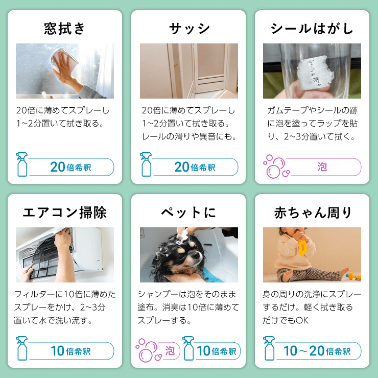 原液をそのまま泡ポンプボトルに入れる | 10倍希釈でスプレーして拭く。ワックス効果もあります | 10倍希釈でスプレーして拭く | バケツの水5Lに10ccを入れスポンジやタオルで拭く | 2~3倍希釈でスプレー後、2~3分後にすすぐ | 10倍希釈でスプレーして拭く | フィルターに10倍希釈でスプレー後、2~3分後に洗い流す | 7kgに原液40cc投入。つけおき洗いがおすすめ | 泡をのせて数分おいた後に洗う | 10倍希釈でスプレーして拭く | 10倍希釈でスプレー | 泡をそのまま塗ってシャンプー | 1000倍に薄めた水に20分程つけおき洗う | 20倍希釈でスプレー後、1~2分後に拭く | |